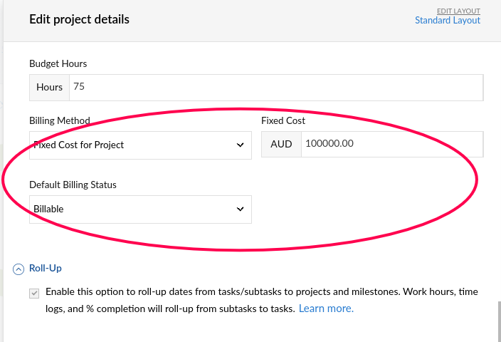 In Zoho Projects, you can run projects based on Time and Materials - where you invoice the actual hours and costs going into the project - or Fixed Fee. In a Fixed Fee project, it does not matter how much effort is spent completing the tasks, or how much material is consumed - the project is invoiced at a fixed, predetermined cost (example - buy a house off a plan, and the contract states it will cost $415.000 to build that house against specifications).